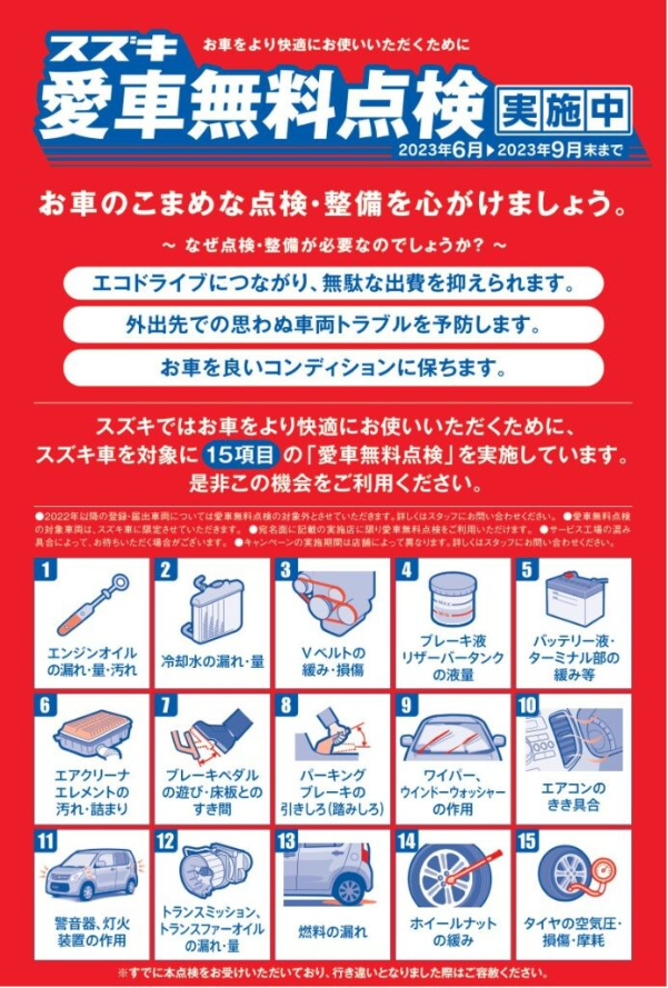 6月1日〜9月30日まで、スズキ愛車無料点検を実施しております。