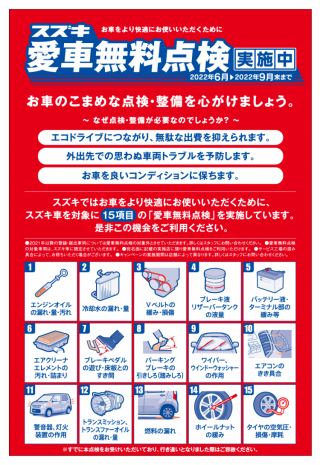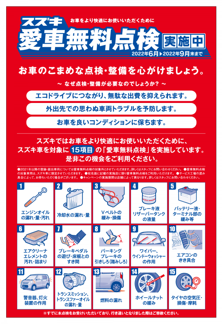 6月1日(水)〜9月30日(金)までスズキ愛車無料点検を実施しております。